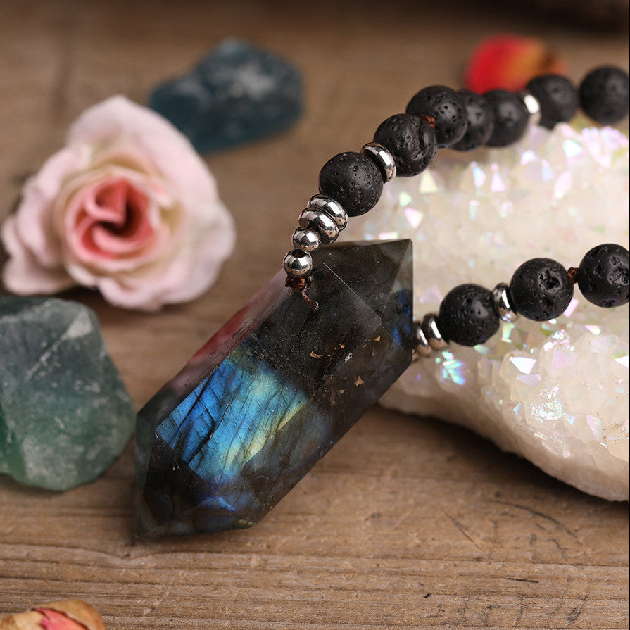A ponta de labradorite natural actua como um verdadeiro escudo energético, protegendo o campo áurico enquanto expande a percepção, a intuição e a ligação aos planos subtis.