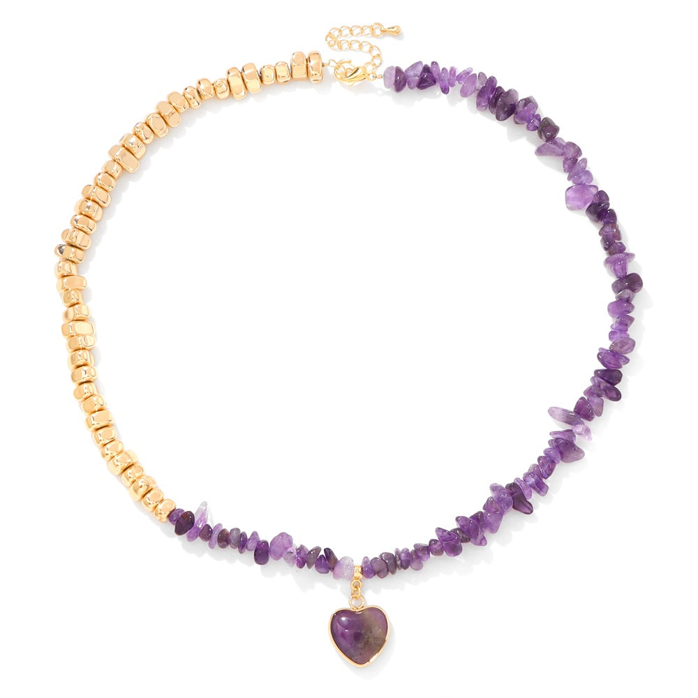 Colar artesanal com missangas douradas e pendente em coração de ametista natural.