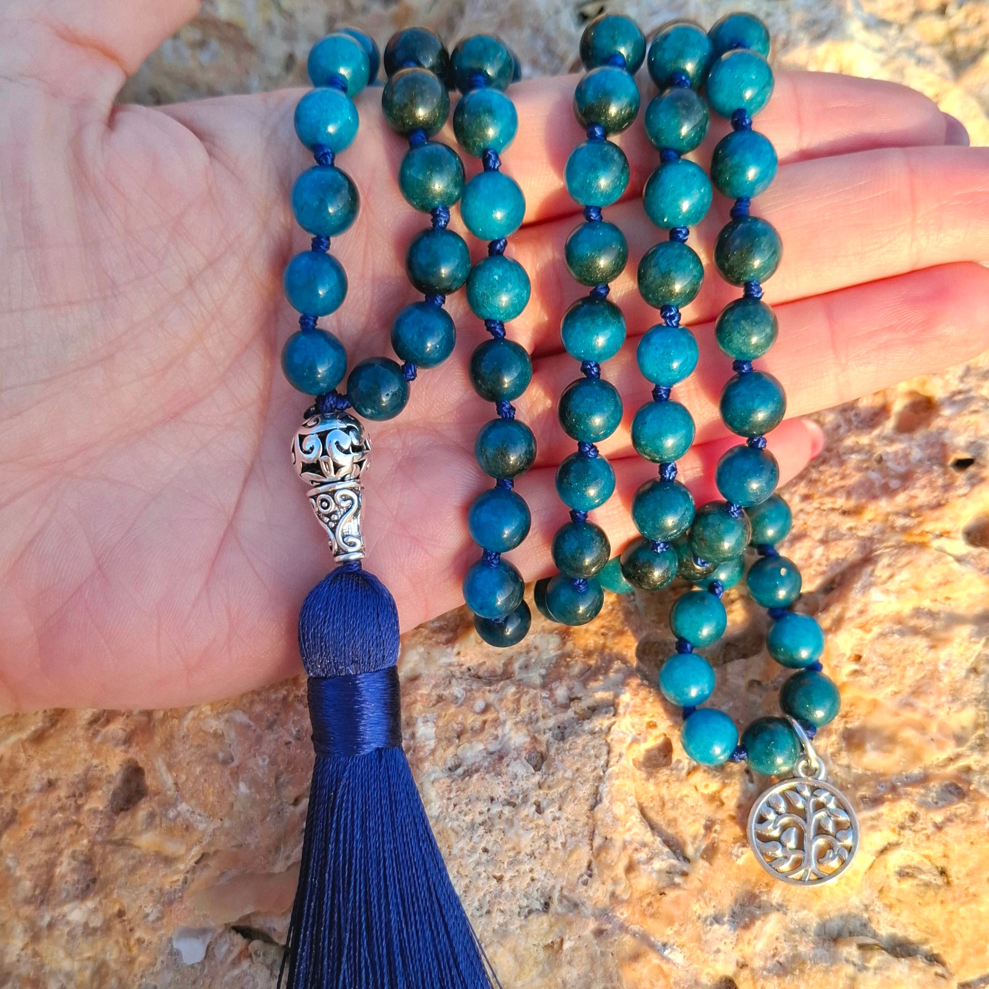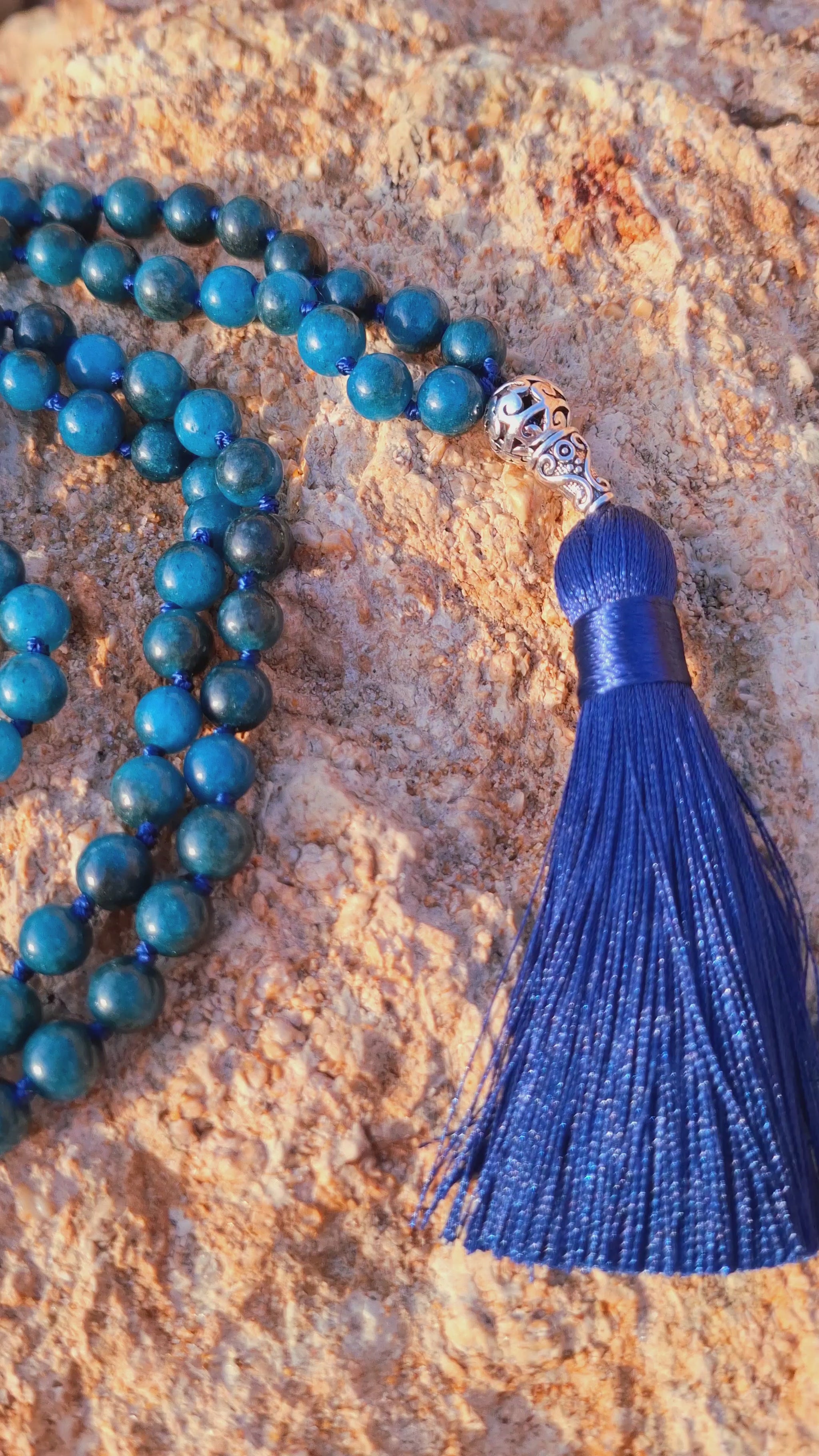 Este japamala não é apenas um acessório; é um guia para uma jornada interior de calma e sabedoria. A Apatita Azul é conhecida como a pedra da manifestação e da inspiração, perfeita para quem deseja alinhar a mente e o coração. Ao meditar com a Apatita, você se conecta com sua intuição mais profunda, fortalecendo a comunicação consigo mesmo e com o universo. 🌌💙