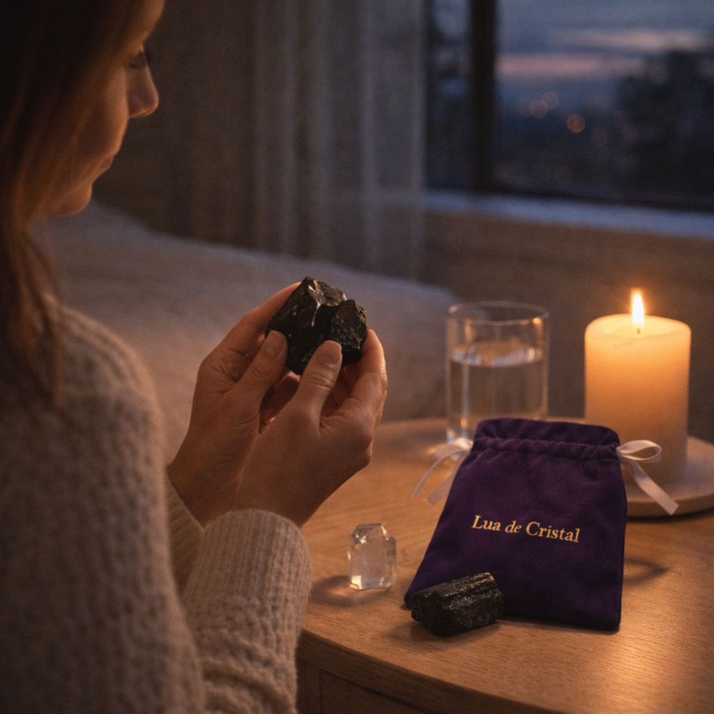 - Turmalina Preta (bruta): um dos cristais mais poderosos para absorver e transmutar energia negativa. Atua como um escudo protetor, bloqueando influências externas indesejadas e promovendo o enraizamento.